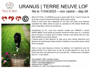 Actuellement en famille d’accueil (un grand merci à eux pour leur réactivité et leur accueil ), nous avons réalisé qu’URANUS a besoin d’une famille qui prendra vraiment le temps de l’accompagner. Il ne faut pas le brusquer ; il a besoin d’évoluer à son rythme pour vous faire confiance et se sentir rassuré.