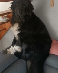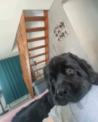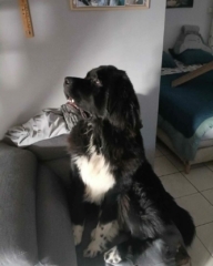 je suis URANUS, un jeune mâle Terre-Neuve de 1 an et demi, pesant 54 kg. Je suis un gros nounours très timide, gentil, joueur et propre.